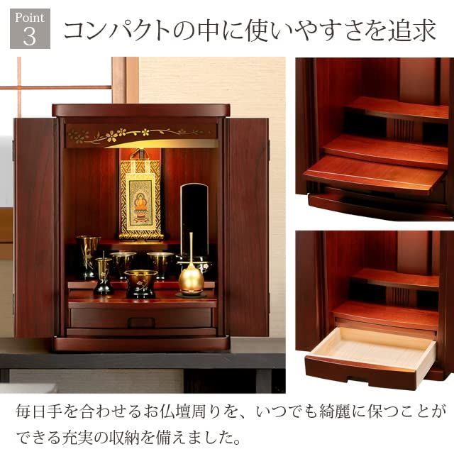 欄間の桜がほのかに光るモダンミニ仏壇 欄間の桜が内部のライトに照らされ美しく光るモダンミニ仏壇です。扉や内陣、背板を含めお仏壇全体を同じ色で統一して仕上げています。コンパクトなので設置スペースを気にせずに設置が可能です。使いやすい収納スペースなど機能的にも充実しています。