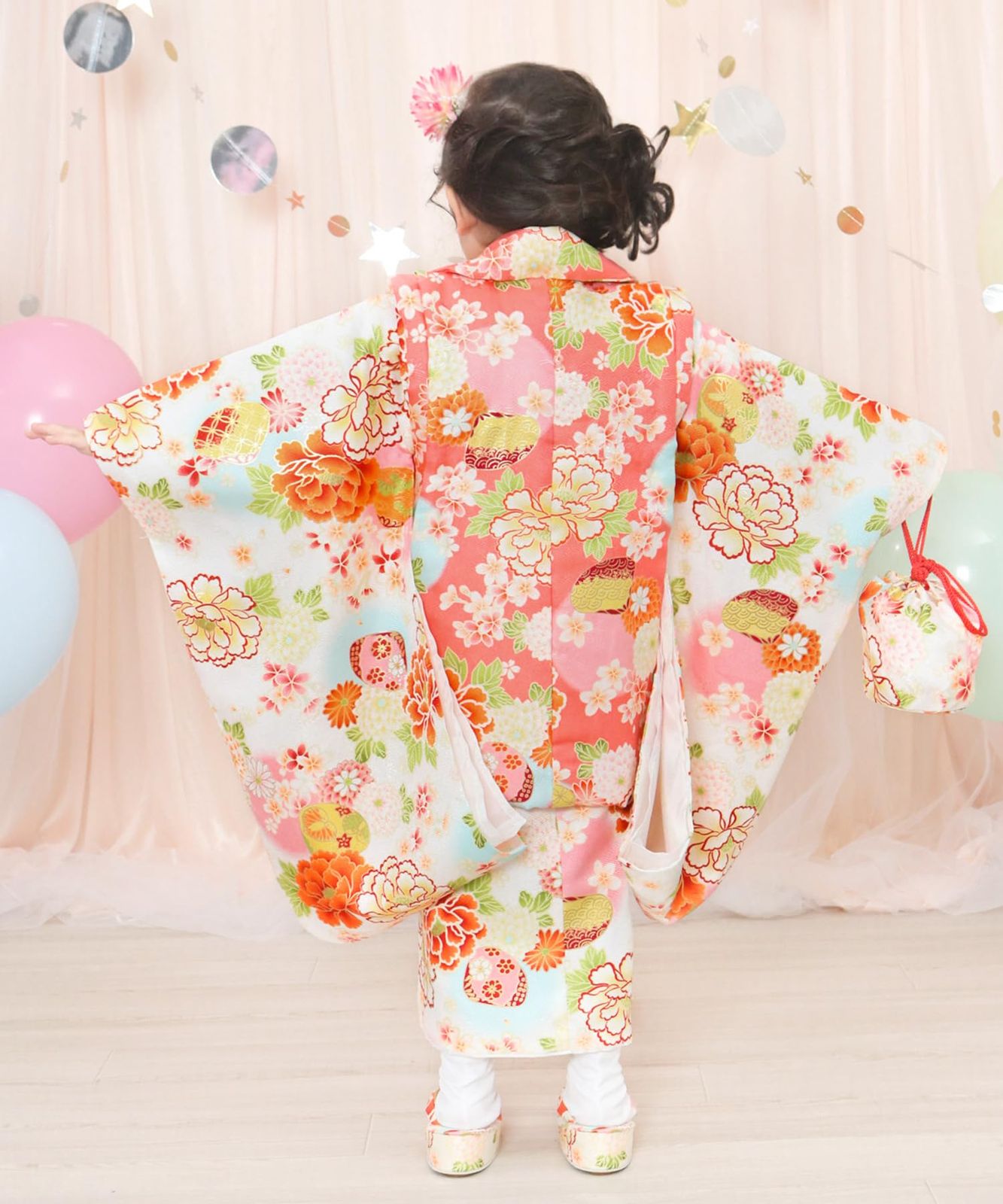 ・3歳の女の子への七五三祝いに。一生の思い出を彩るかわいいデザインの着物セットを揃えました。巾着や髪飾りなどの小物までセットになっているので、届いてすぐに着られます。