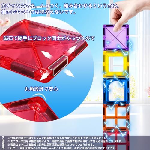 【安全で無毒な】質の高いプラスチック(食品級のABSプラスチック)材料を作られ、BPAを使用しておりません。安心に遊んでください。子供の安全は私たちの最優先事項です!日本安全協会が制定した日本玩具安全標準(ST標準)に満たし、ASTM、CCPC、EN71全て認定済みです。 誤飲する可能性は否定できません。親子揃って、遊ぶことをオススメします。6歳以上のお子様に適しています。警告:本製品には小型磁石が含まれています。磁石を誤って飲み込むと、腸内で互いに引き合い、深刻な感染症や死亡を引き起こす恐れがあります。万が一、磁石を飲み込んだり吸い込んだりした場合は、直ちに医師の診察を受けてください
