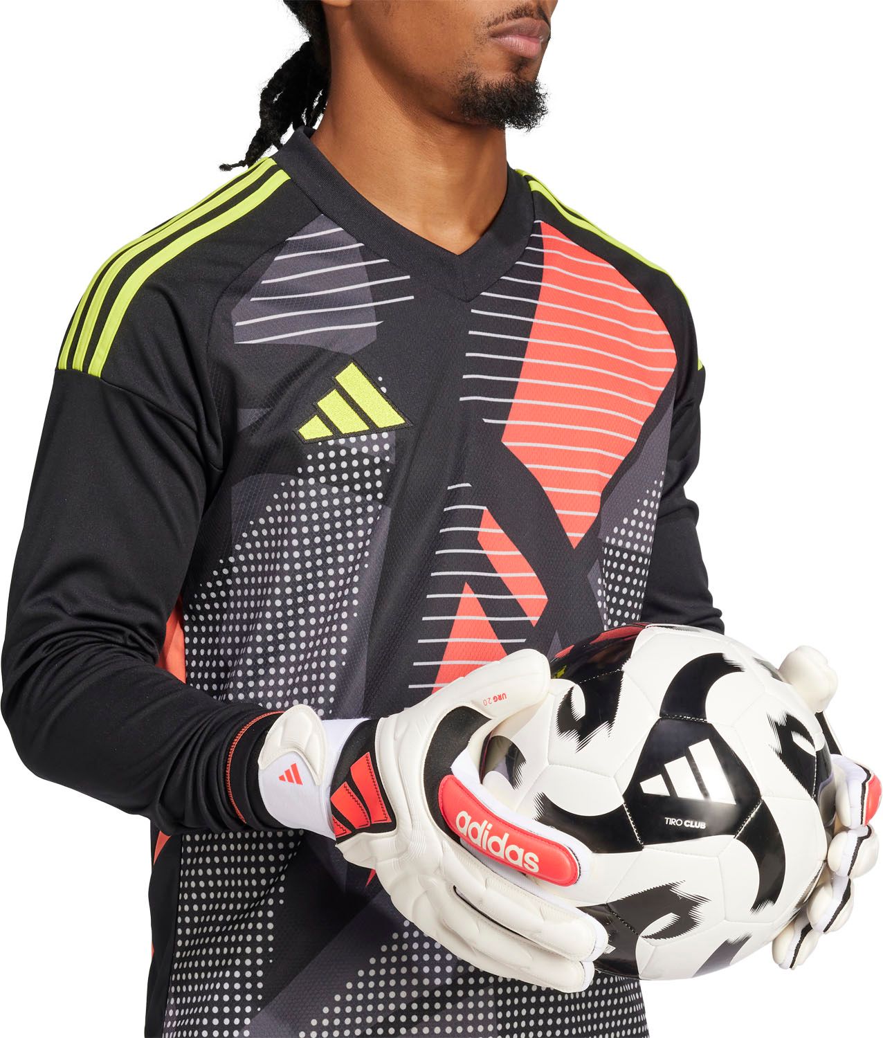 アディダスのコパ PRO ゴールキーパーグローブを手に、絶対的な守護神としてチームを勝たせよう。高性能でデザインがクラシックなこのグローブは、通気性のあるメッシュと手の甲にラテックス、手のひらにはグリップ力に優れた URG 2.0 を採用している。伸縮性のあるリストストラップが手首をしっかりと固定。フィンガー部分にはぴったりしたフィット感を提供するネガティブカットを採り入れ、自然な着け心地に仕上げている。