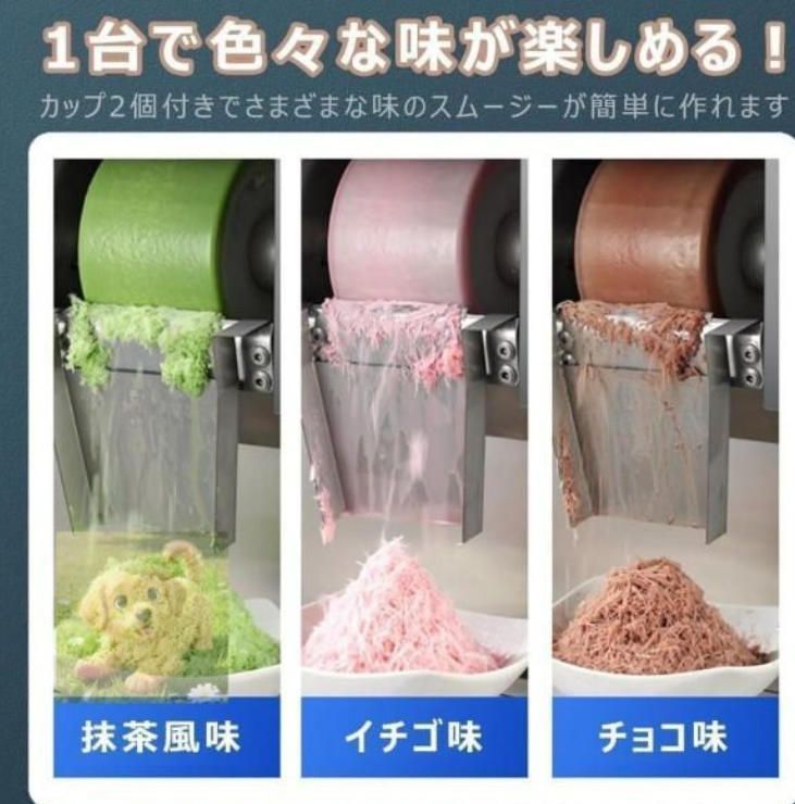 フレーク、スムージー、アイスクリーム、ミルクシェイク、ヨーグルトアイシング、その他のおいしいフローズンデザートを作るのに最適です。牛乳、ジュース、コーヒー、ビール、ワイン、または他のフレーバージュースをベースとして使用できます。刻んだフルーツ、ジュースシロップ、チョコレート、アイスクリーム、コンデンスミルク、小豆、ナッツ、タピオカミルクティー、サゴなどの甘いトッピングを自分で作ることができます。