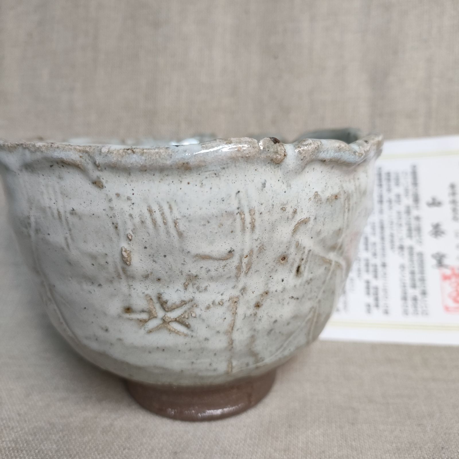 創作斑茶碗になります、縁は花弁縁で、線刻紋が描かれた焼き物になります。