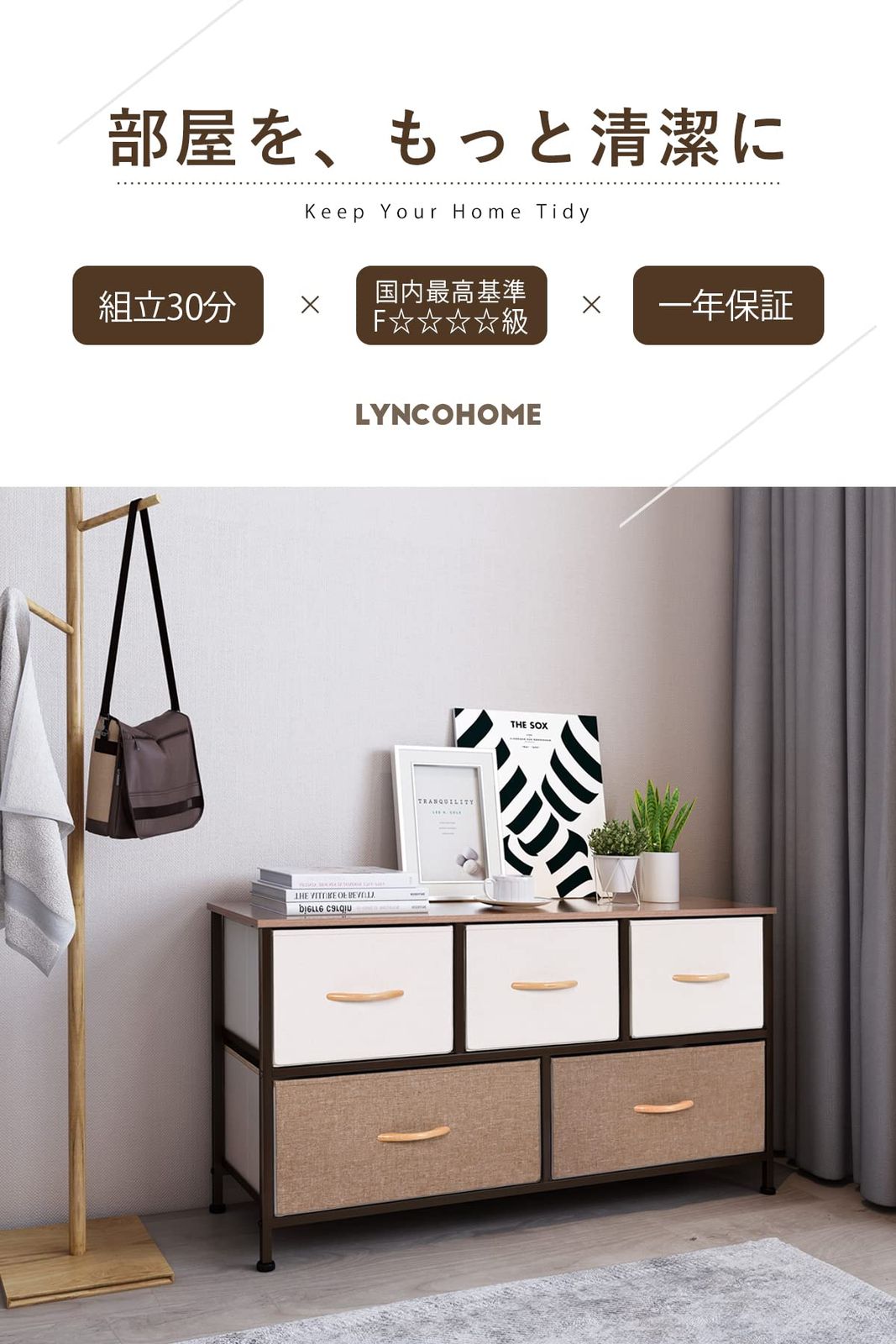 LYNCOHOME チェスト テレビ台 収納 おもちゃ箱 布製 引き出し 簡単組立 リビング 衣類収納 一人暮らし 2段5杯 木材 和風 【幅100×奥行30×高さ54.5 cm】