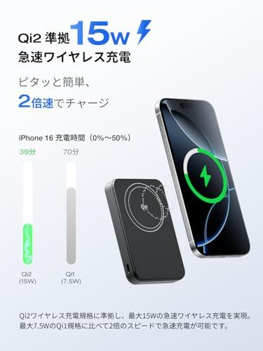 【最大36WUSB-C急速充電】最大36W出力のUSB-Cポートを1つ搭載しているため、ケーブルによる充電も可能。iPhone 16をわずか 26 分で 50% まで急速充電します。