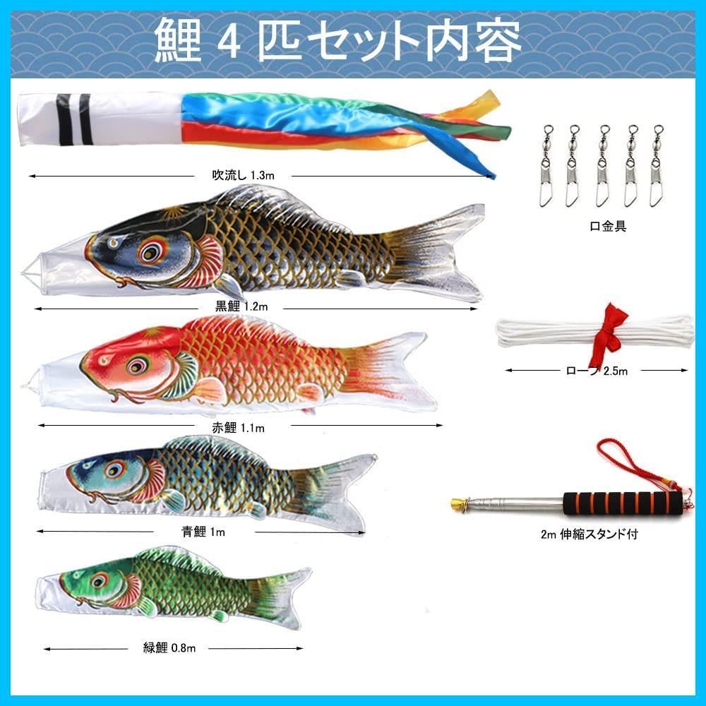 【2022年度新作鯉のぼり】金龍鯉金箔押セット内容:五色吹流し1.3m・黒鯉1.2m・赤鯉1.1m・青鯉1m・緑鯉0.8m・ロープ・口金具・取付器具・・2m伸縮スタンド付。