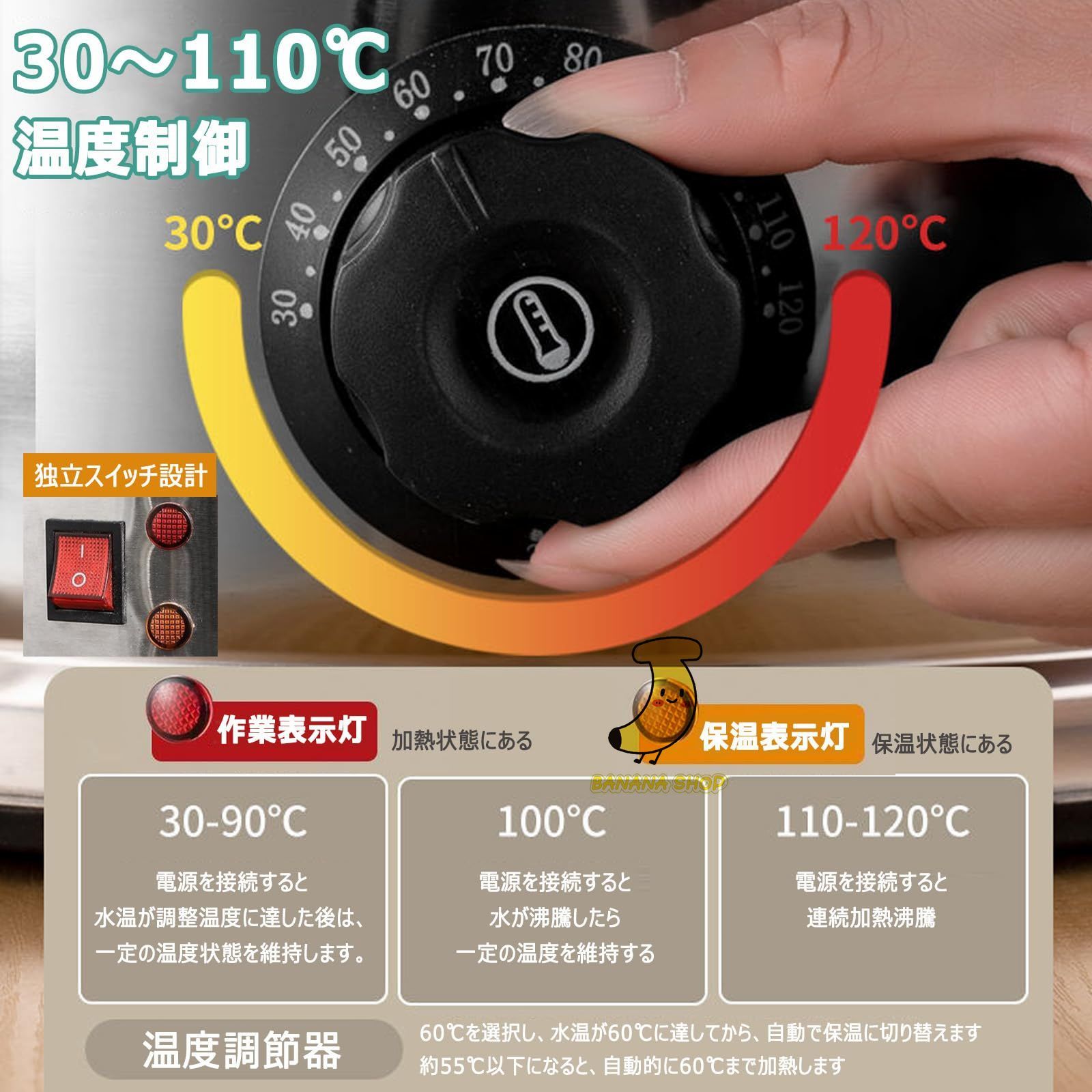 ? ?【恒温設計】プラグを差し込むと、水温を常に30~110℃に制御できます。 60℃を選択すると、自動的に水温を60℃に保ちます。 常に110℃以上で加熱沸騰し、ハーブティーやミルクティー、熱湯などを作ることができます。 二重構造の肉厚バレルにより保温効果が高まります。