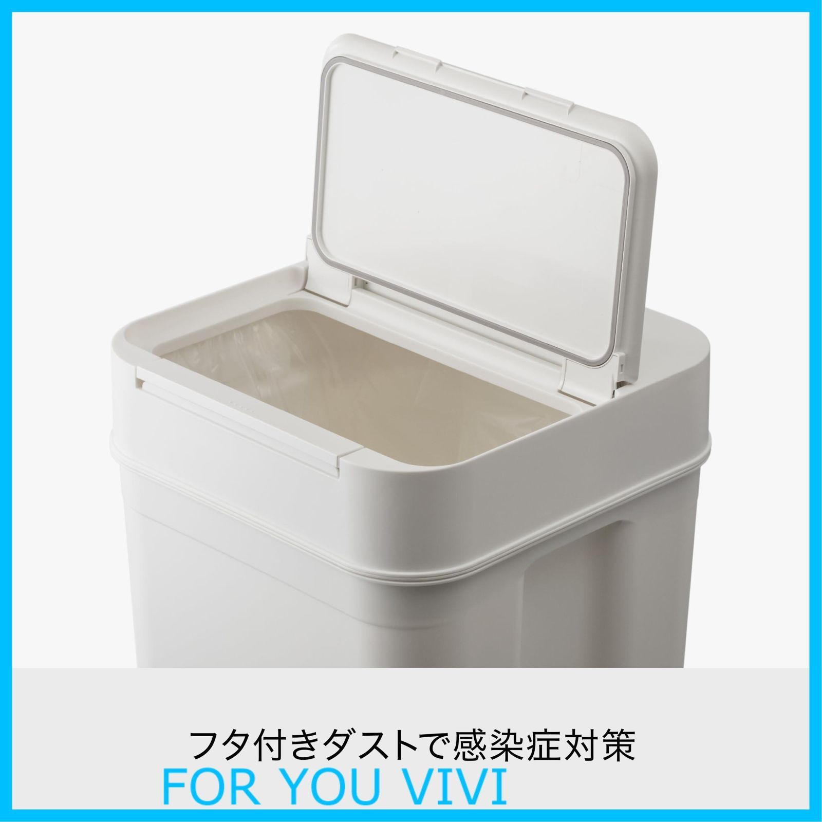 ニオイにフタするスリムデザインのダストボックス。特徴1:シリコンパッキン(ニオイ漏れ防止)構造。特徴2:ワンプッシュで大きな間口が開閉。特徴3:袋クリップホール構造でゴミ袋の設置楽々。特徴4:スリット構造でダスト内分別(2種類まで)が可能。