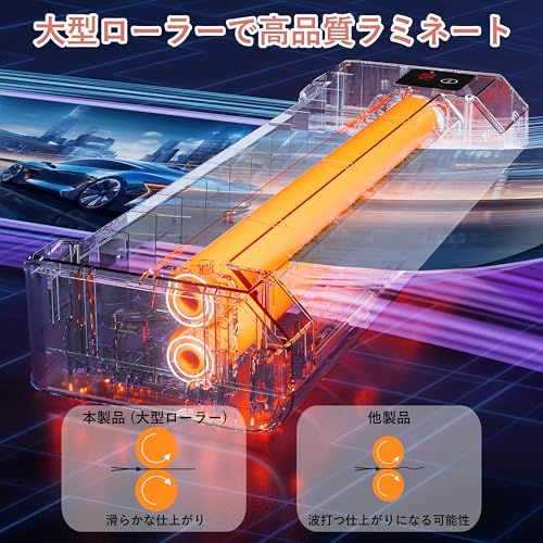 【高品質仕上げ】一般的なラミネーターのローラーと比べ、直径が約50%大きい大径2本ローラーを採用。圧力と熱が均一に伝わり、より滑らかで美しいラミネート仕上がりを実現します。