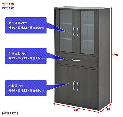 山善(YAMAZEN) 食器棚 キャビネット キッチン 収納 引き出し付き ガラス扉 幅60×奥行29×高さ120cm 棚板可動 組立品 ダークブラウンCCB-1260(DBR)