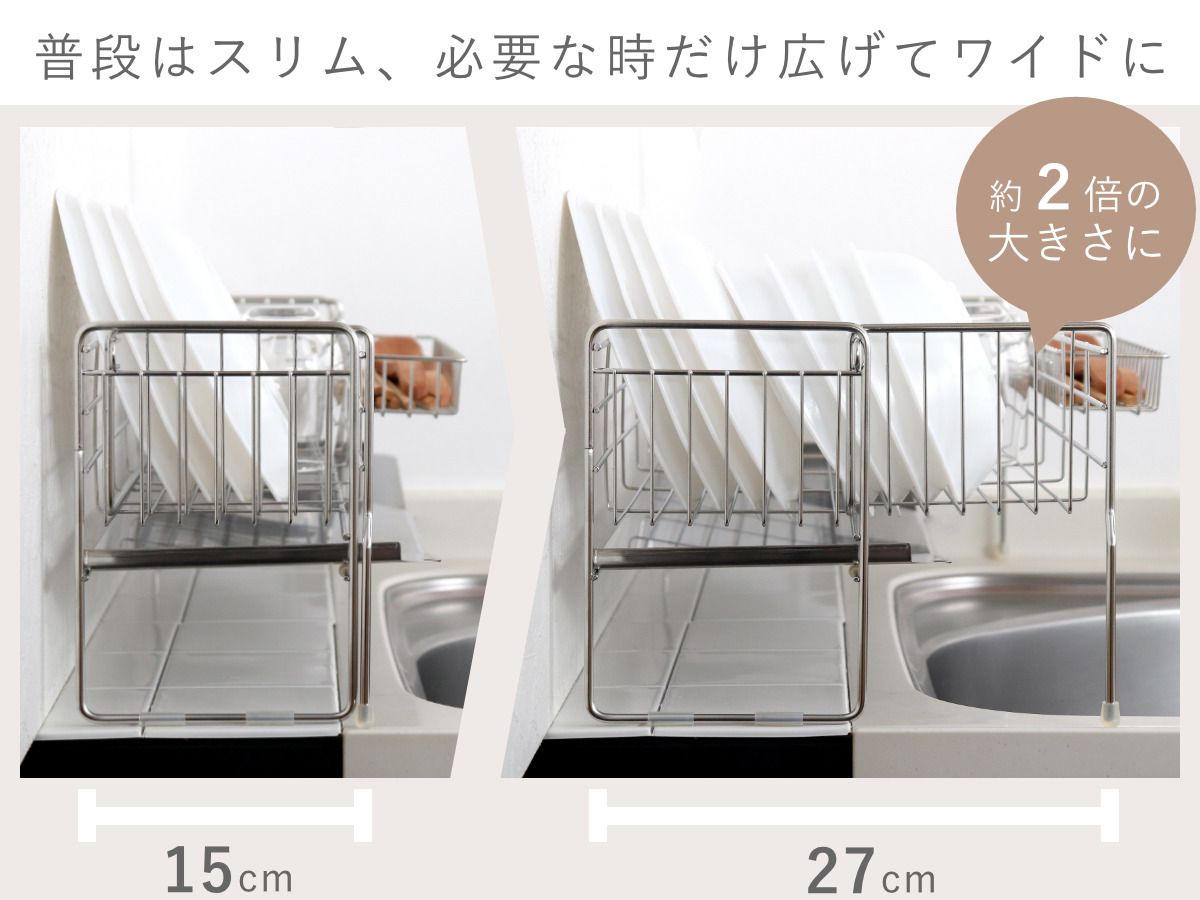 ●洗い物の量に合わせて幅を伸縮できる水切りラックです。