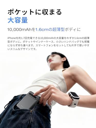 【ポケットに収まる10,000mAh大容量】iPhone 16を最大1.7回充電できる大容量を約1.6cmの薄型ボディに。スマホやイヤホンなど、長い1日でも充電を切らさない安心の1台です。