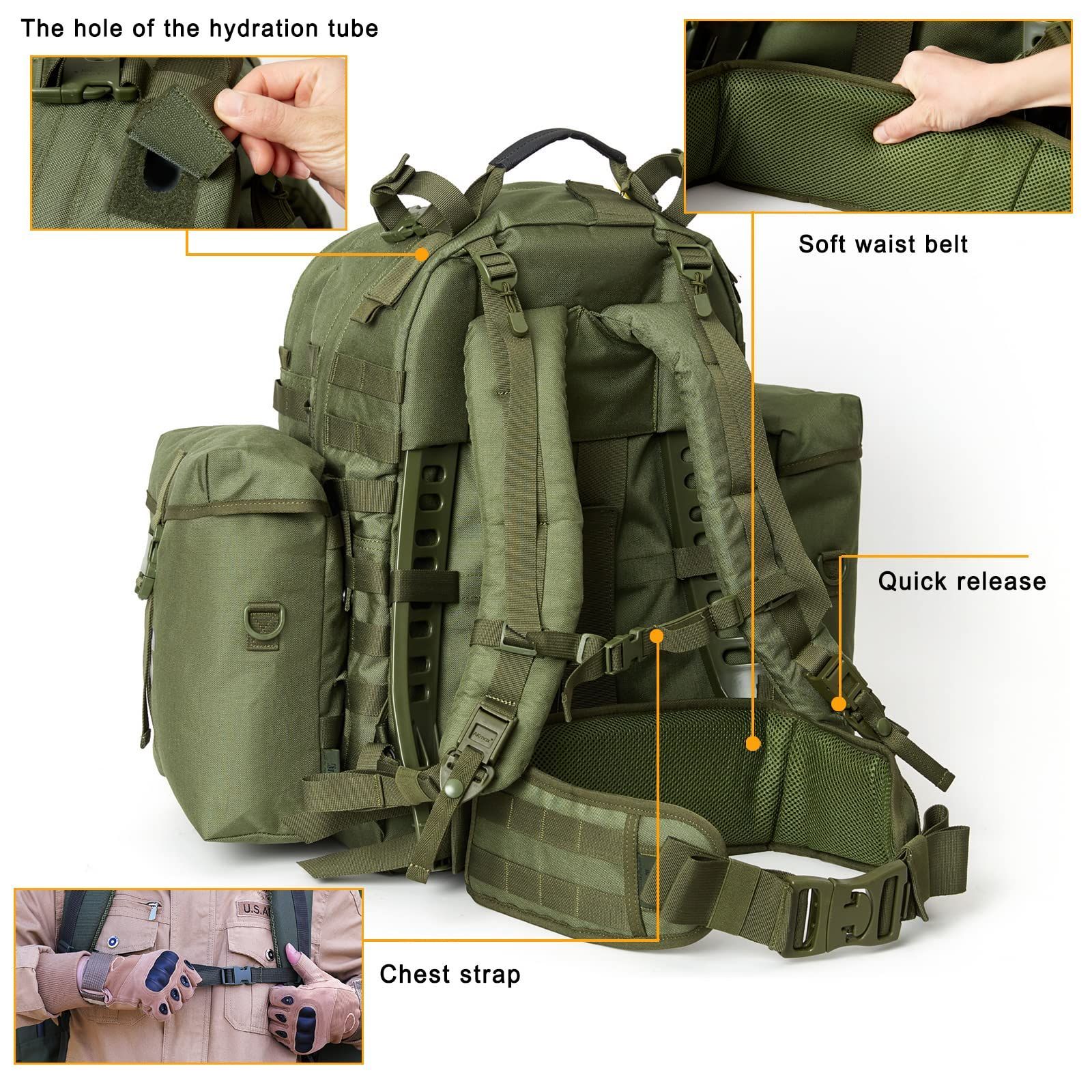 【多機能デザイン】頑丈なハンドルとクイックリリースストラップが付属から、他のMOLLEバックパック、メッセンジャーバッグなどを携帯簡単です。そして、ホックとループポート3つあり、アンテナ、ハンドセット、ハイドレーションを搭載でき、サバイバルに大活躍します。