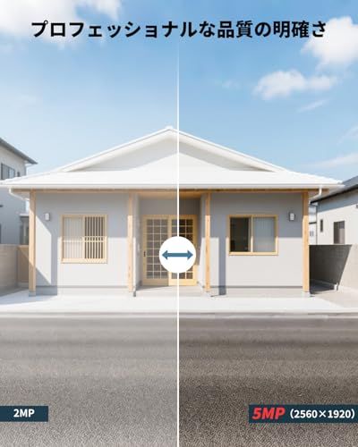 {高解像度5MP} この防犯カメラは500万画素 (5MP) の解像度を誇り、卓越した鮮明さと細部までの詳細を提供します。この高解像度により、シャープでクリアな映像を実現し、監視性能が格段に向上します。屋内外の監視でも、重要なディテールを正確に捉え、優れたホームセキュリティを提供します。