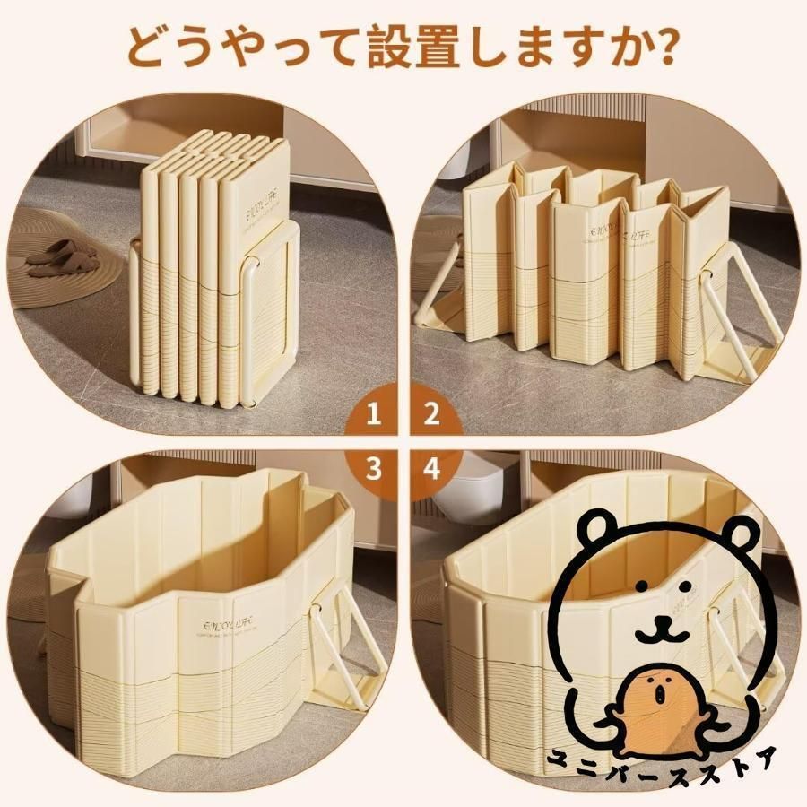 【コンパクトで収納が簡単】:折りたたみバスタブのポータビリティは最も大きな魅力の一つです。入浴後は簡単に折りたたみ、バスルームの隅やクローゼットに収納でき、場所を取ることはありません。