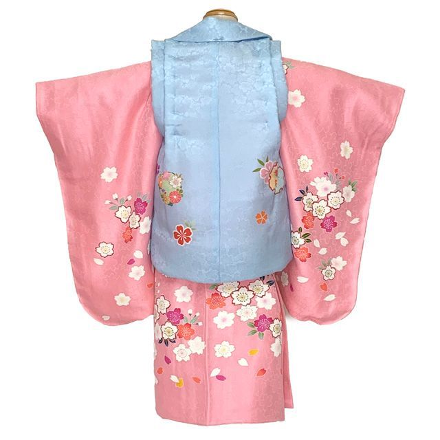 七五三 着物 3歳 正絹 フルセット 女の子 友禅 絵羽柄の着物 被布セット 水色xピンク 鞠と桜 w bBset