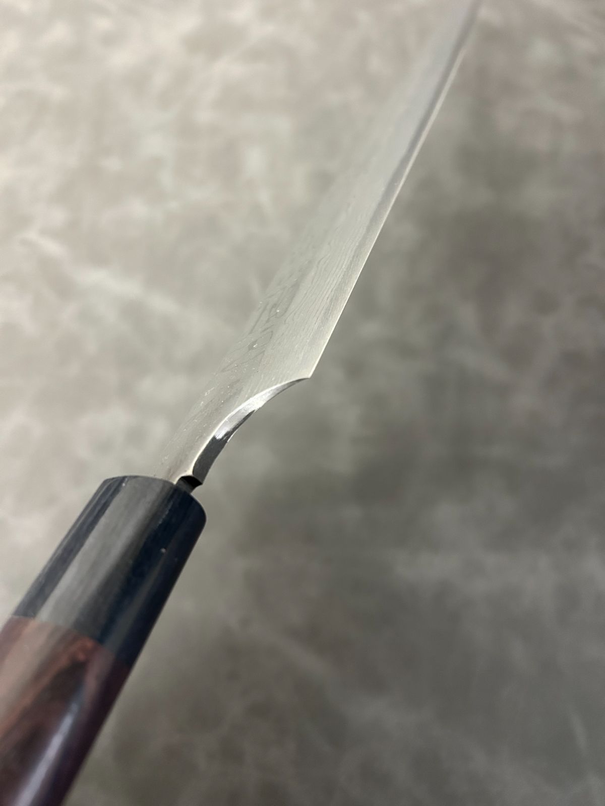 柄は紫檀シノギを使用しており、10層のダマスカスで見た目が美しい和包丁に仕上がりました。