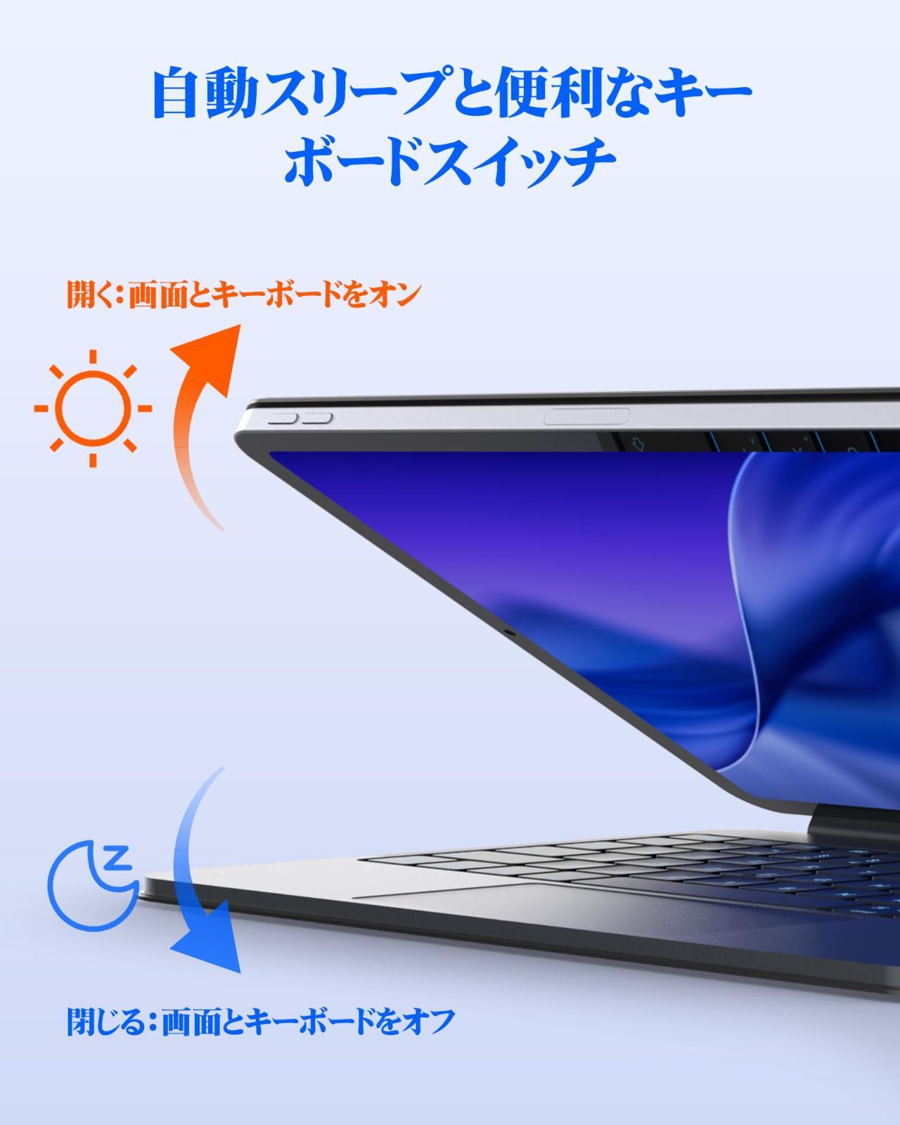 【スマート電源スイッチ】便利使用のため、電源スイッチはスマートスイッチを更新して、ケースの開閉によりキーボードの電源が自動的にオン/オフになり、同時iPadスクリーンもオートスリープ状態になります。隠れた充電ポートはヒンジにシームレスに接続されており、美観的に見た目もすっきりしています。