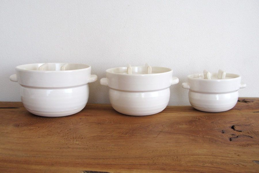 かもしか道具店のごはんの鍋3合。1合でかるくお茶碗3杯分です。白は貫入が目立ち、使い込むほどに味わいが増します。