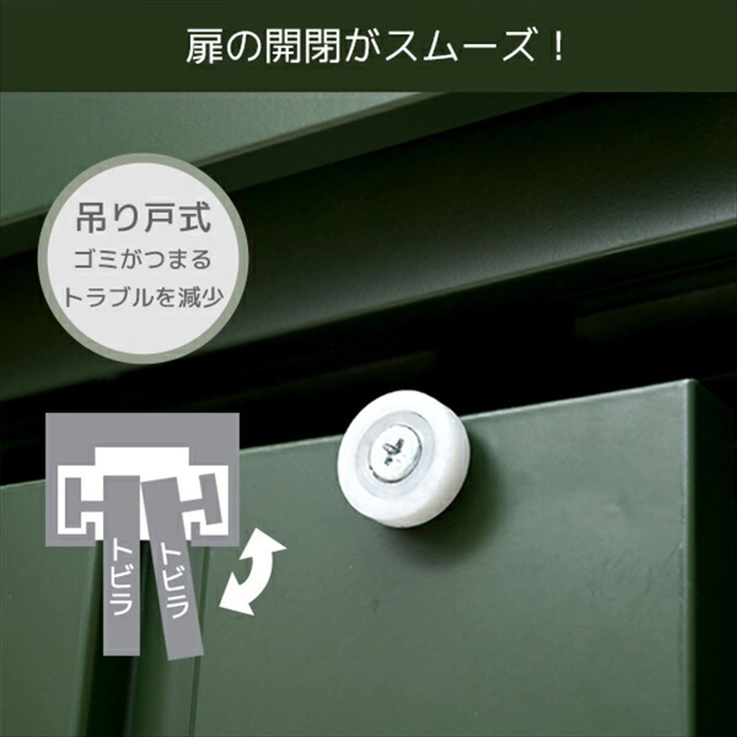 ●組立品です●組立時間:約30-40分●フロント扉に深めのスリットをデザインしたおしゃれなのスチール物置き●カラーはお庭のグリーンや爽やかな青い空にマッチするカーキを採用●ハイテンション亜鉛メッキ鋼板採用で硬度UP●衝撃に強く、サビにも強い●扉に吊り戸式を採用し、開閉がスムーズ●収納物が出し入れしやすい下部レール部フラット●安心の専用鍵付き●収納部内寸:幅89×奥行34.5×高さ74cm●可動棚1枚付き(高さ約10cmピッチ)●可動棚サイズ:幅89×奥行33.5×高さ2cm※完全防水ではないため、吹き込みなどによる雨水侵入のおそれがあります