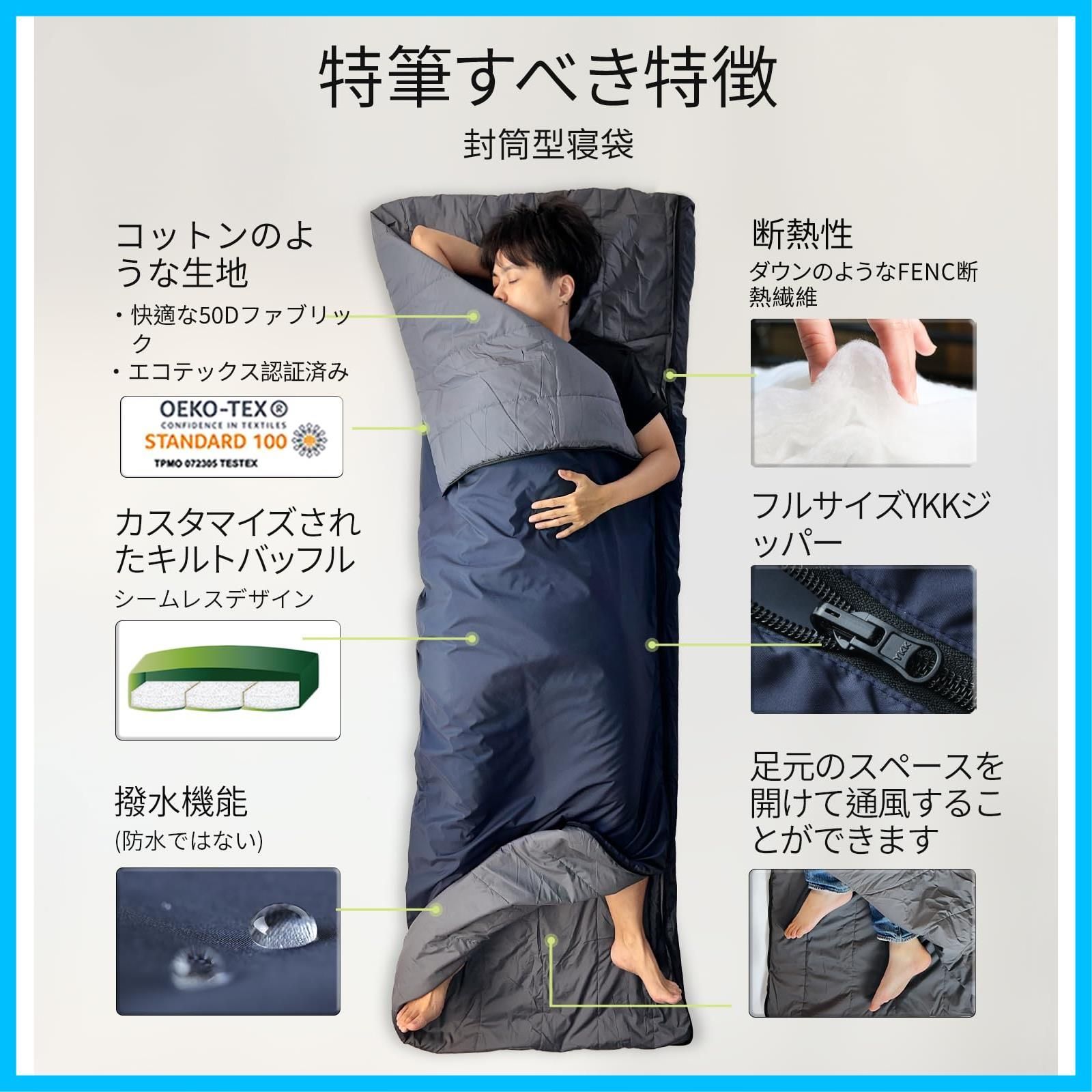 FENC断熱材とお手入れが簡単:この寝袋はFENC断熱材を備えており、合成ダウンファイバーよりも優れた利点を提供します。強化された弾力性、より高い充填力、改善された保温性、およびダウンのような圧縮性により、並外れた性能を提供します。さらに、洗濯機で洗えるのでメンテナンスが簡単で、便利で手間のかからない掃除ができます。