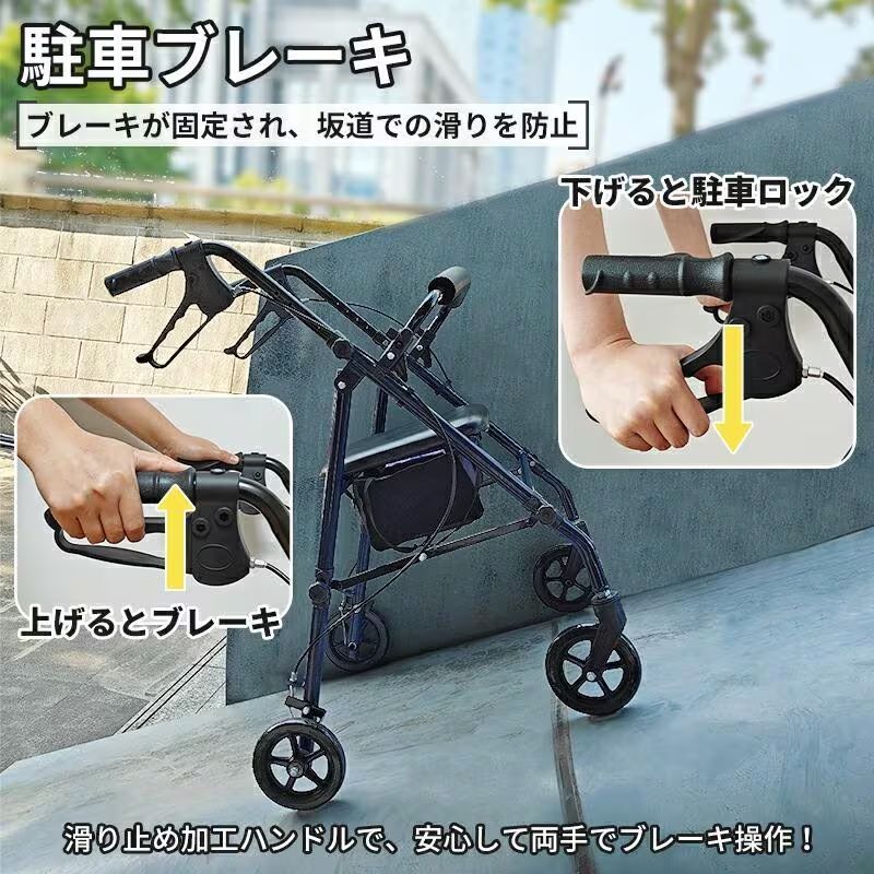【歩行サポートと休憩を一台で】本製品は、歩行を補助するだけでなく、疲れた時に座って休憩できる便利な2WAY設計です。クッション入りの座面と背もたれ付きで、腰かけた際も安心・快適です。移動と休憩を一台でこなせるため、外出中の負担を大幅に軽減します。