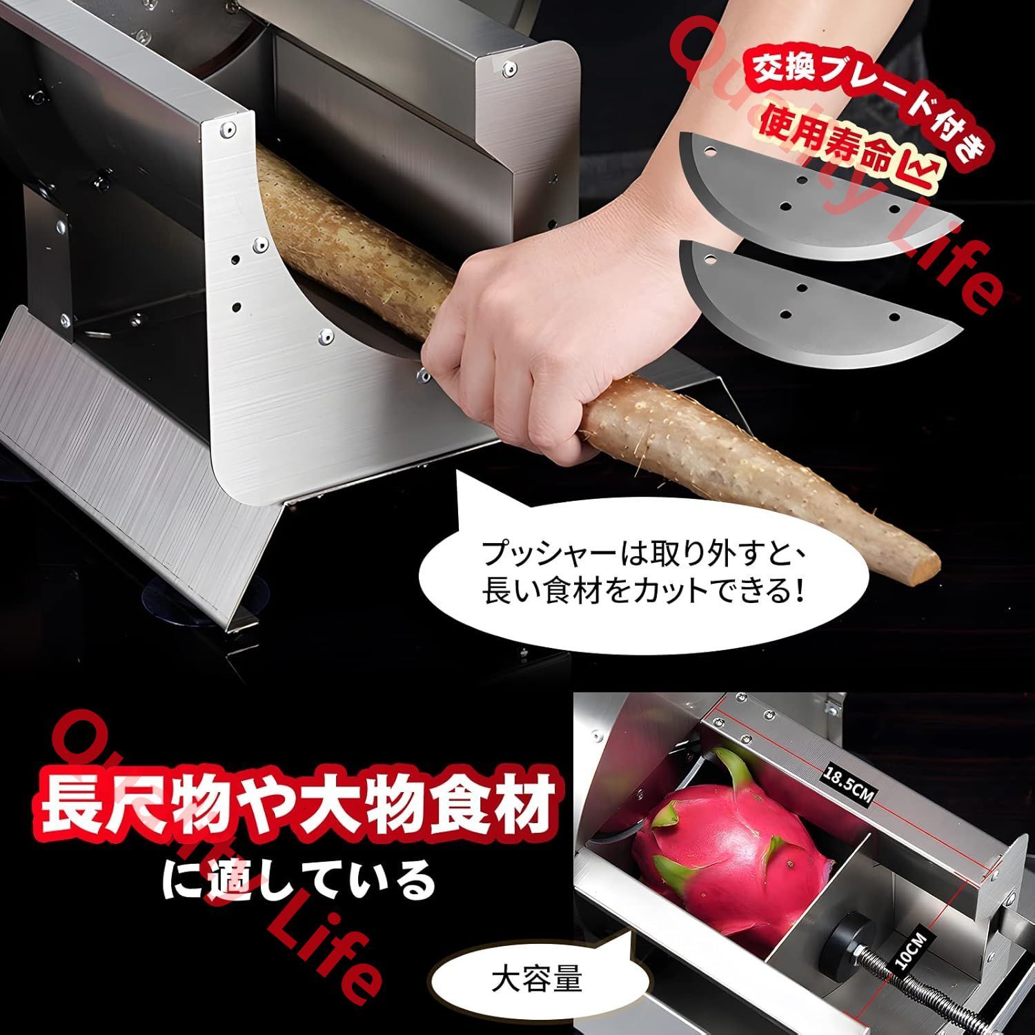 【自由に調整】0-13mmの厚み調整範囲、薄切りも厚切りも満足できます。食材の長さによって、プッシャーは取り外すと、長い食材をカットでき、効率化UP!