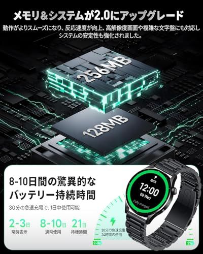 【メモリ&システム2.0にアップグレード、操作性や文字盤がさらに快適に】FOSMET QS40 Proは、システムを最新の2.0バージョンにアップグレードし、睡眠・血中酸素・心拍数・ストレス測定などの機能が、FOSMET FITアプリに頼らずスマートウォッチ上で直接操作可能に。 また、メモリを256MBに増強したことで、動作がよりスムーズになり、処理速度・安定性が飛躍的に向上。常時表示機能も強化され、常時表示文字盤(アナログおよびデジタル)の設定だけでなく、アプリ連携で20種から選択可能。 文字盤が自動で切り替わる場合: 「手首を上げてウォッチフェイスを切り替える」設定がONになっていないかご確認ください。「設置」「ディスプレイと明るさ」「ウェイク」内の該当項目をオフにすることで解除できます。もちろん、iPhone / アンドロイド対応しております。