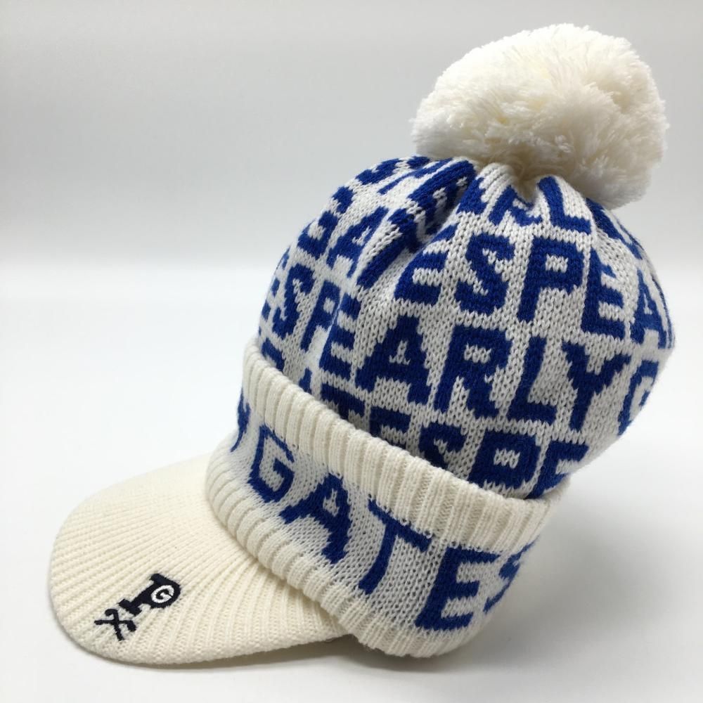パーリーゲイツ つば付ニット帽 白×ブルー ロゴ総柄 ボンボン付 FR ゴルフウェア モデル PEARLY GATES