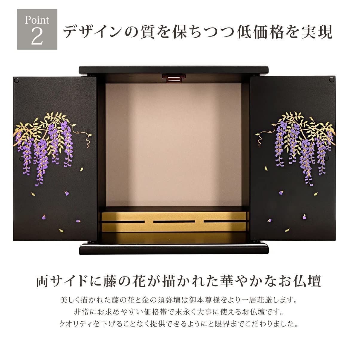 コンパクトで扱いやすいお手頃なお仏壇です。シンプルで場所を選ばないデザインとなっており、 扉を開くと両サイドには藤の花が鮮やかに描かれています。