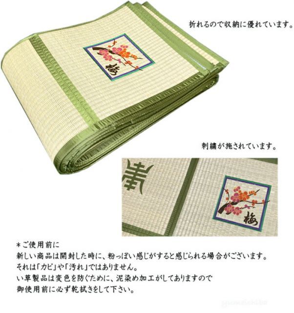 韓国では冠婚葬祭の場面でよく目にするい草のカーペット。韓国の高潔な四君子・梅蘭菊竹の刺繍を入れたとても重宝なカーペットです。