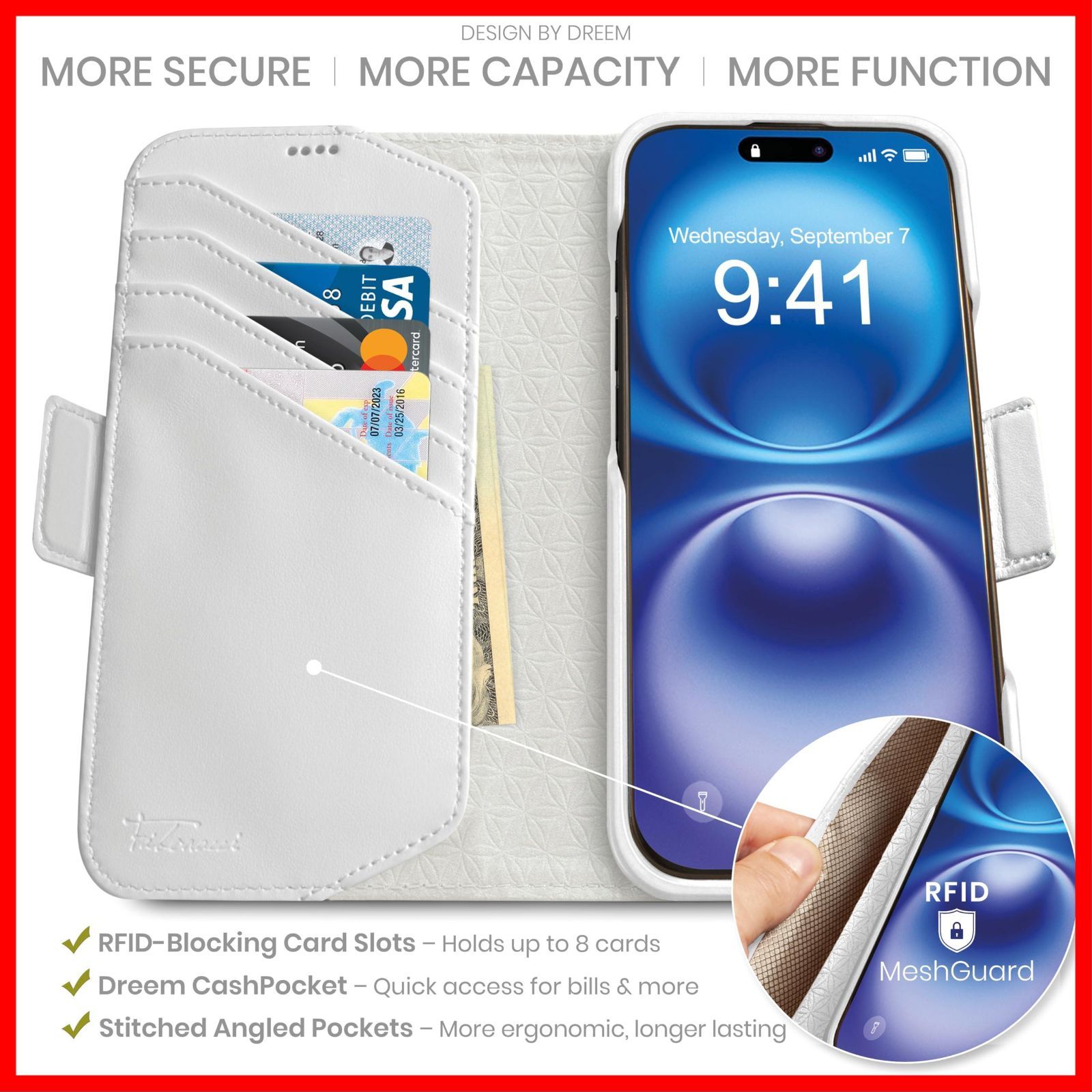 Dreem フィボナッチ(Fibonacci)2イン1 財布型ケース Apple iPhone 16 Pro Max用 - 高級ヴィーガンレザー製 マグネット着脱式 耐衝撃 携帯電話ケース RFIDカード保護機能 2通りに使えるフリップスタンド付き - [ホワイト]