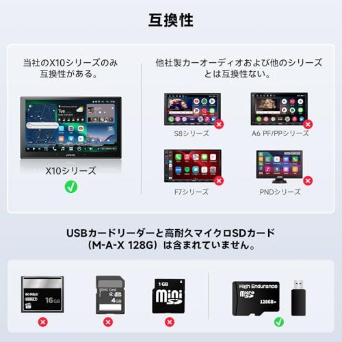 互換性に関するお知らせ:X10シリーズにのみ対応、S8、A5、A6 PF/PP、F7、PNDシリーズ、またはサードパーティ製カーオーディオには対応していません