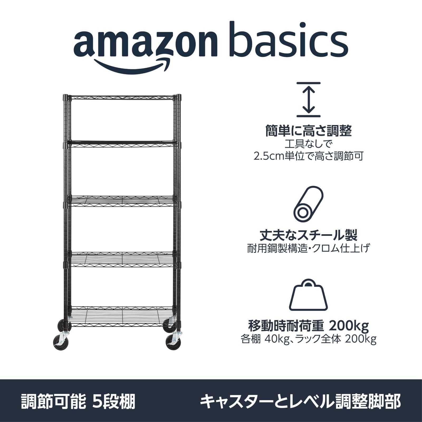 商品 ベーシック 5段スチールラック 棚 メタルラック キッチンラック キャスター付き 耐荷重200 kg 幅76 奥行36 高さ165 cm ブラック