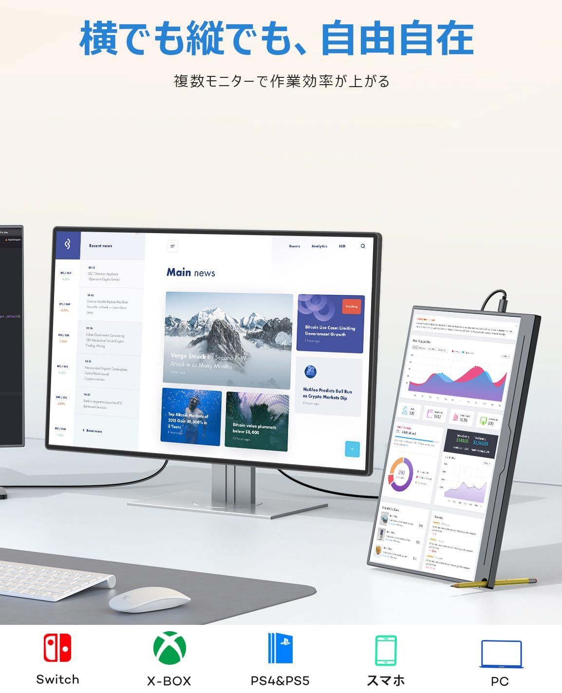 【15.6インチ大画面フルHD&HDRモード】モバイル モニターの画面解像度はゲーム、動画視聴や事務作業に最適な迫力の15.6インチ大画面フル HD(1920×1080)です。上下178°、左右178°の広い範囲で一定の視認性が得られる自然な色合いを表示できるIPS液晶パネルを採用して、どの角度から見ても鮮やかな映像をみることが可能です。HDR表示対応しているので、PS4ゲームなどのHDRコンテンツも美しい色彩描写を最大限に発揮して楽しめます。ポータブルデイスプレイは拡張モード・複製モードを対応の上、横表示はもちろん、縦置きでも簡単にスタンドできます。ご注意:スマホ接続時は縦設置フル画面表示できない、ご了承ください。