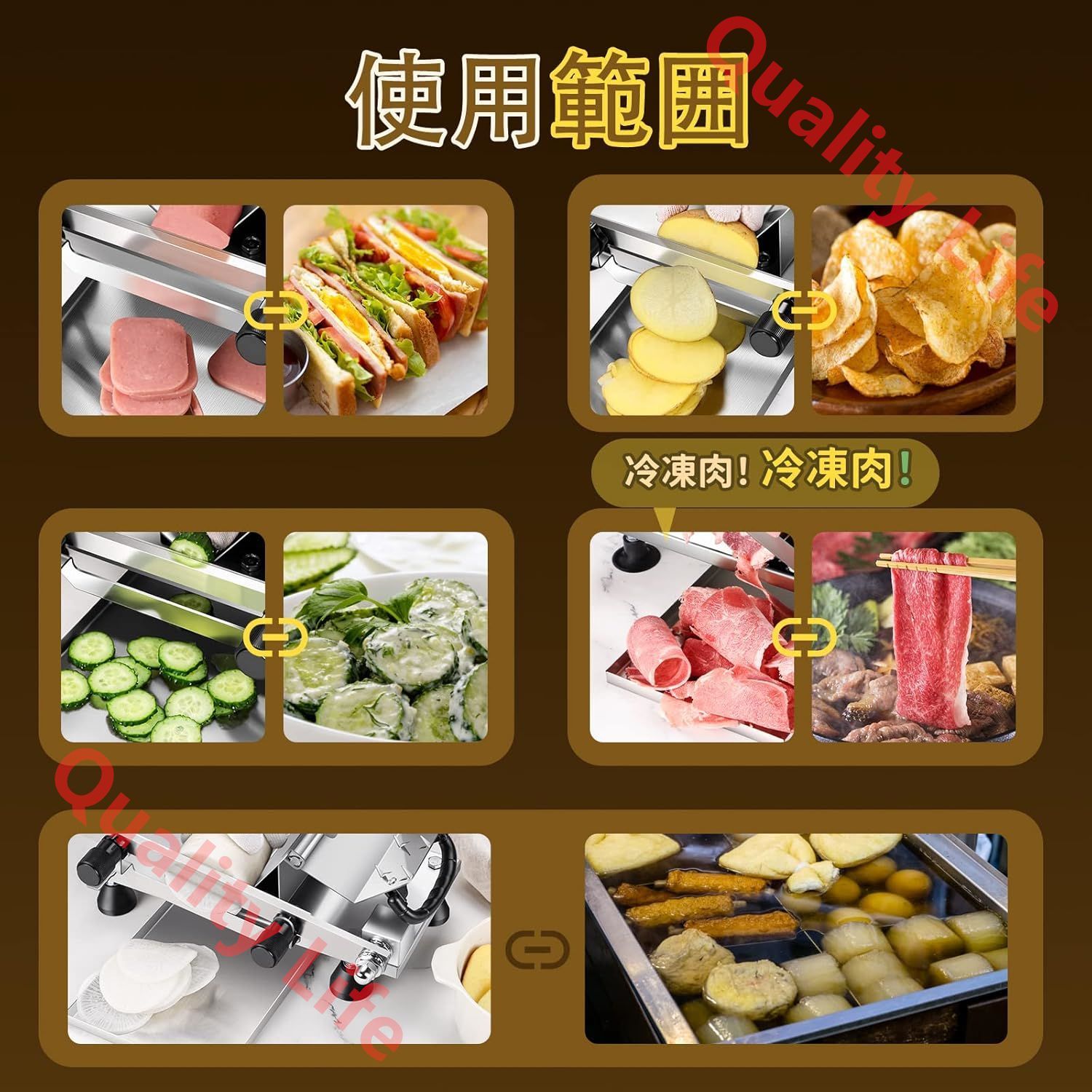 【性能プラス】ミートスライサーは肉押すフタ付き、手が凍るのを心配する必要がありません。研ぎ石と交換ブレード付き、製品の長寿命化を実現します。詳しい日本語説明書付き、簡単に厚さを調節できます。
