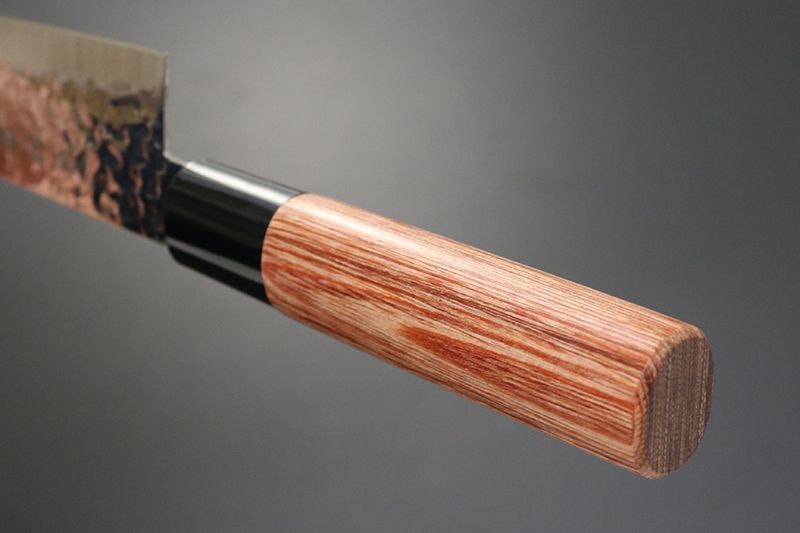 和包丁風のハンドルスタイル。ハンドル材は美しい木目調の赤合板材を使用。鋭い切れ味とメンテナンスの良さを兼ね備えた包丁。鎚目磨きは風合いが美しいだけでなく、食材がブレード面にくっつきにくいこともあり、切れ味を助長し切離れよく快適にカットできます。