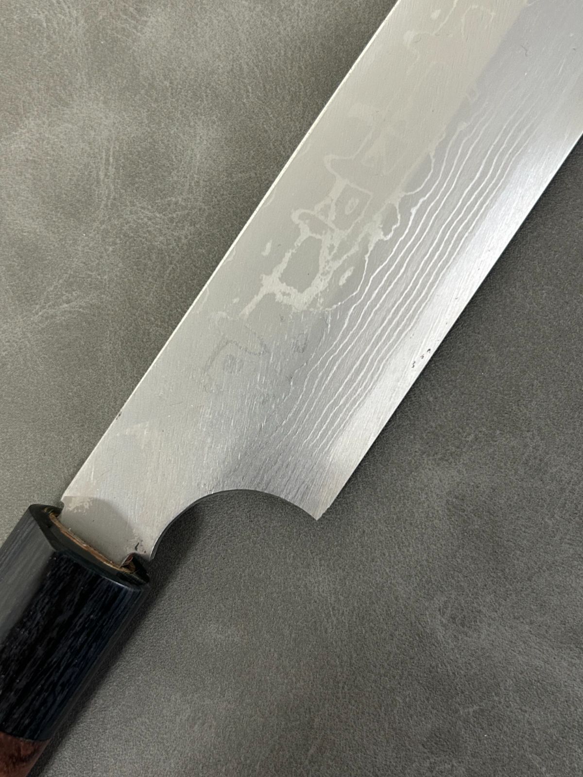 柄は紫檀シノギを使用しており、10層のダマスカスで見た目が美しい和包丁に仕上がりました。