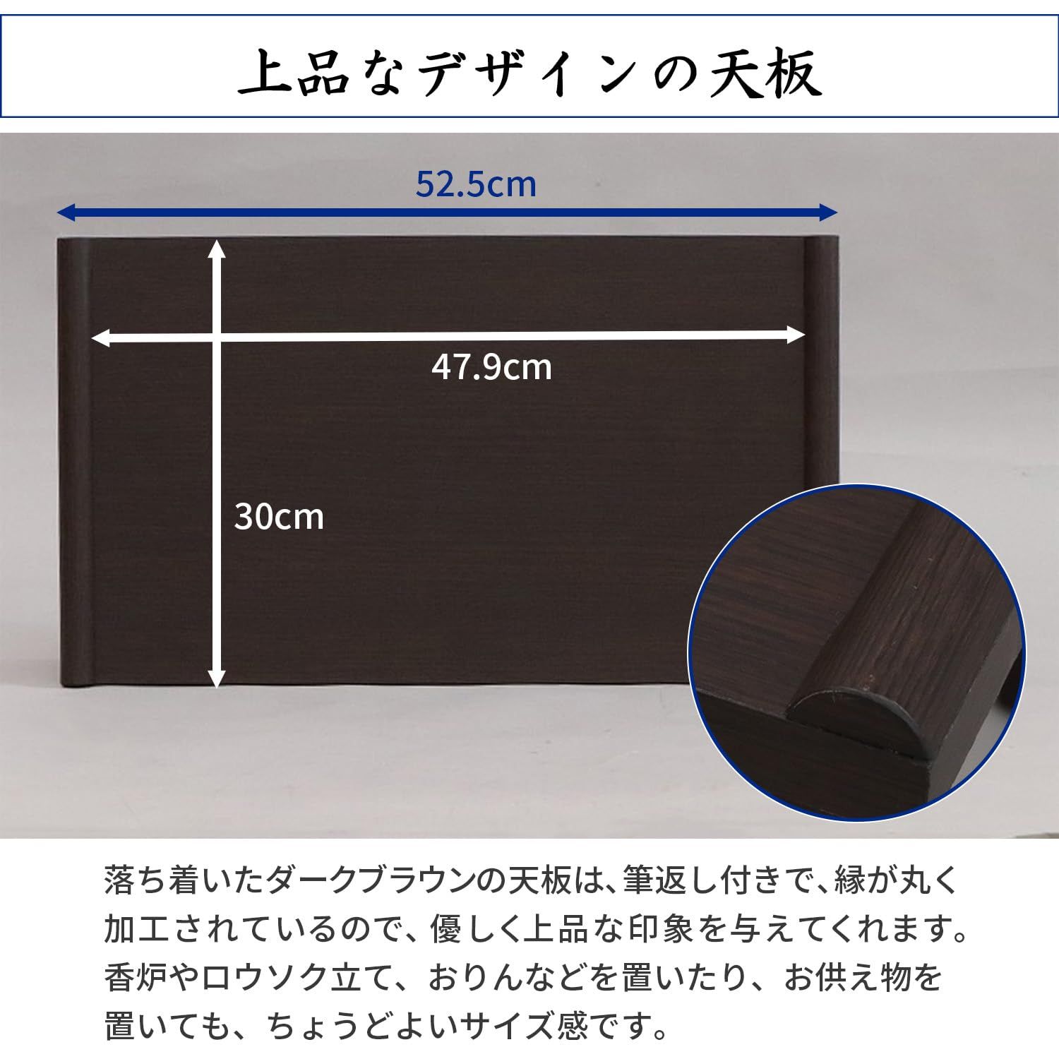 ●落ち着いたダークブラウンのシンプルモダンな供物台は、お線香立てやローソク立て、香炉やおりん、花立てなどといった仏具を置いたり、お供物を置く際などにお使いいただけます。