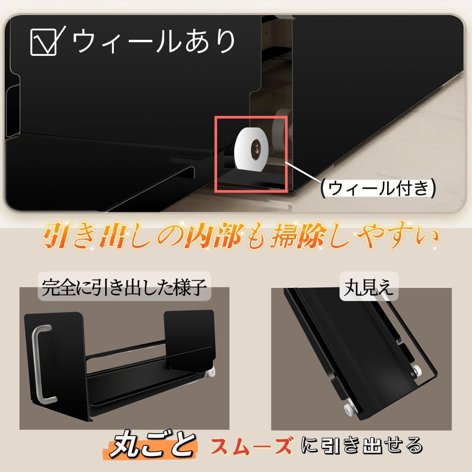 【引き出しの内部も掃除しやすい】引き出しは丸ごと引き出せるので、ラックの内部の掃除もラクラク。両側にはウィールが付いているので、よりスムーズに引き出すことができます。