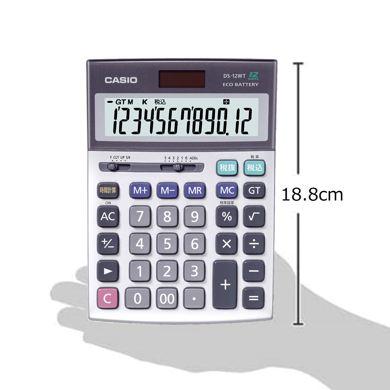 消費税計算もらくらく、税計算機能付き電卓。時間計算機能、12桁モデル。