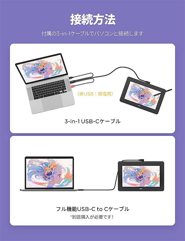 パッケージ内容:U1200液タブx1、電子不要ペンx1、3-in-1USB-Cケーブルx1、延長コードx1、替え芯x10、替え芯抽出器x1、日本語説明書x1 、絵描きグローブx1。
