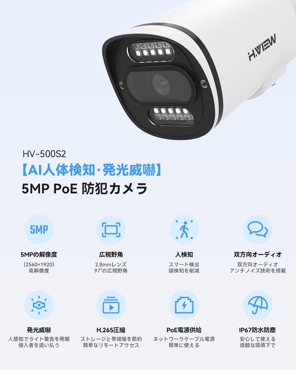 【人体検知・発光威嚇・双方向音声】H.View 防犯カメラ 有線 屋外 PoEカメラ 500万画素 PoE有線接続 5MP 監視カメラ 2.8mmレンズ ONVIF対応 2重灯付き 白色光ライト 投光威嚇 赤外線ライト 暗視撮影30M 人体検出点灯機能 双方向音声 音声マイク・スピーカ一内蔵 遠隔操作 スマホ/PC対応 IP67防水防塵 室内室外用 SDカード録画に対応できず(HV-500S2)