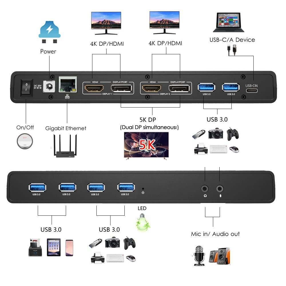 在庫 デュアル4 Kドック 65 WノートPC充電対応 Ultra C HDマルチディスプレイドッキングステーション HDMI 2 DisplayPort ギガビットイーサネット USB 3 0 x WAVLINK 6 オーディオ マイ