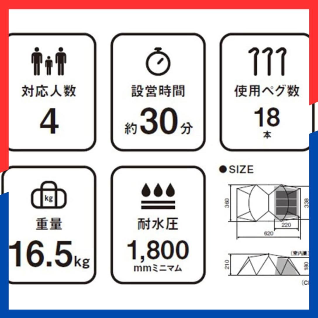 材質:本体/75Dポリエステルタフタ・遮光ピグメントPUコーティング耐水圧1,800mmミニマム・撥水加工・UVカット加工(ルーフ部)、75Dポリエステルタフタ・PUコーティング耐水圧1,800mmミニマム・撥水加工・UVカット加工(ウォール部)、210Dポリエステルオックス・PUコーティング耐水圧450mmミニマム・撥水加工(スカート部)、インナーテント/68Dポリエステルタフタ(ウォール部)、210Dポリエステルオックス・PUコーティング耐水圧1,800mmミニマム(ボトム部)、フレーム/A6061(Φ17.5mm、Φ16mm)