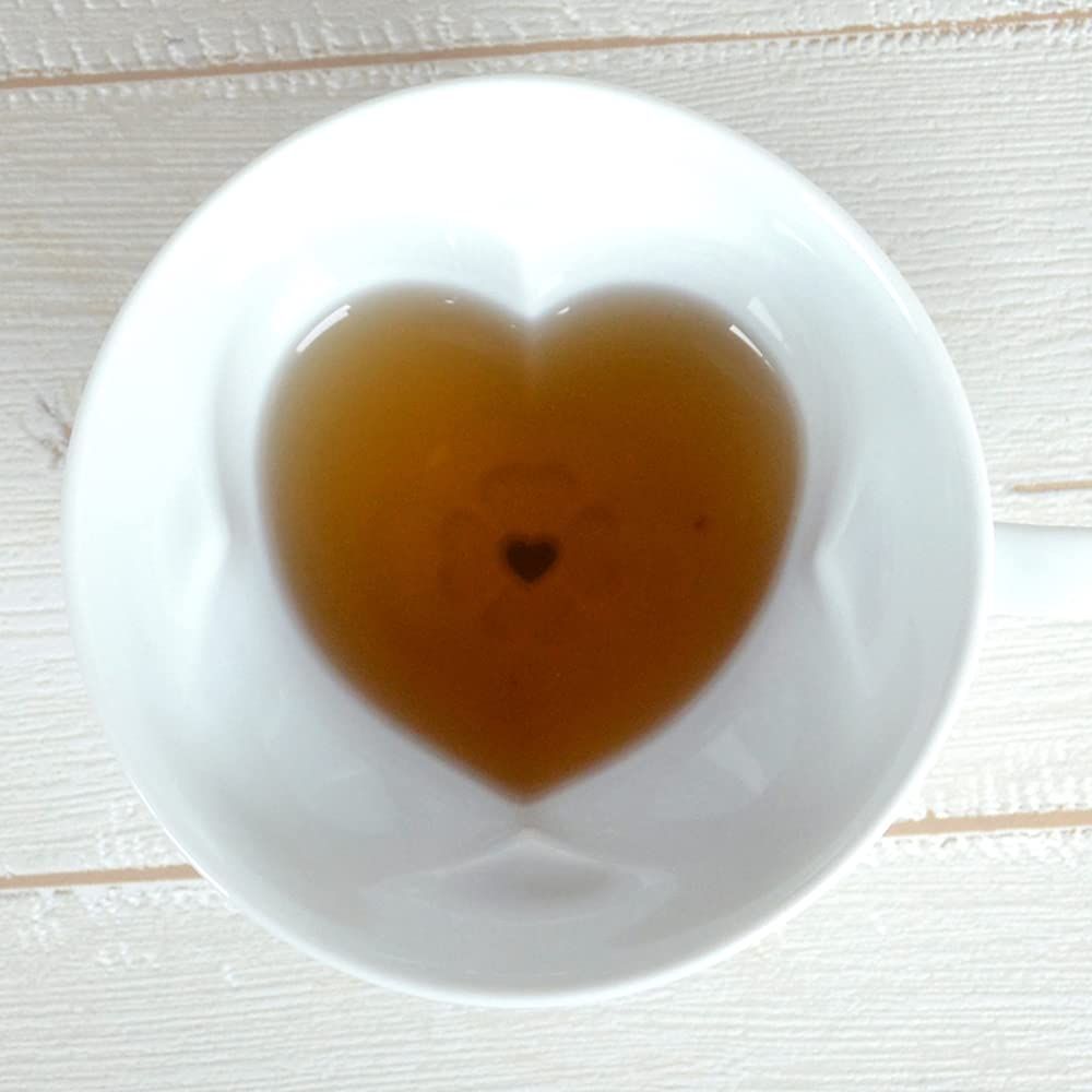 お茶の水面がクローバー形からハート形へと変わっていく、特別な湯飲みです。カップの底には「水晶彫り」と呼ばれる透かし技法が入れられており、シンプルな中にも高い技術で作られたこだわりの逸品です。