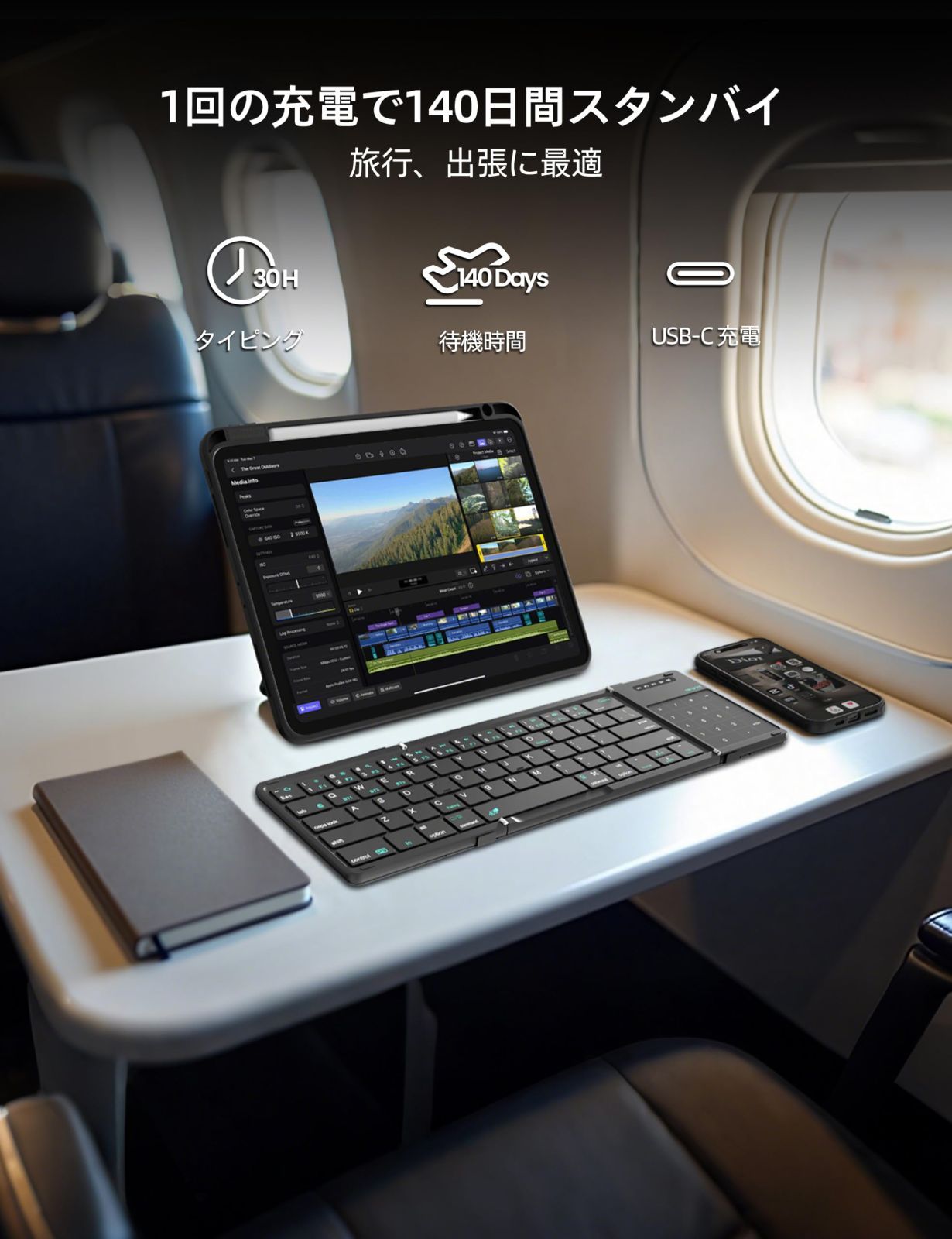 【超長時間スタンバイ・急速充電対応】140mAhバッテリーは、省電力設計により待機最大140日&連続30時間使用を実現。5V/2Aの高速充電に対応しており、わずか30分でフル充電可能です。モバイルキーボードとして日常使用にもビジネス用途にも対応し、旅行や外出先で安心して使えます。