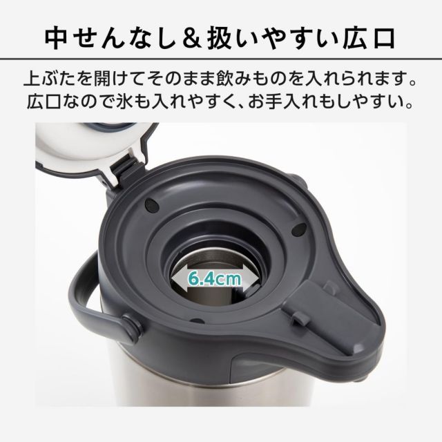 ●広口タイプなので、使いやすくお手入れも簡単。●広口の中せんなし構造で給水しやすい。●大きなプッシュプレートで注ぎやすい。