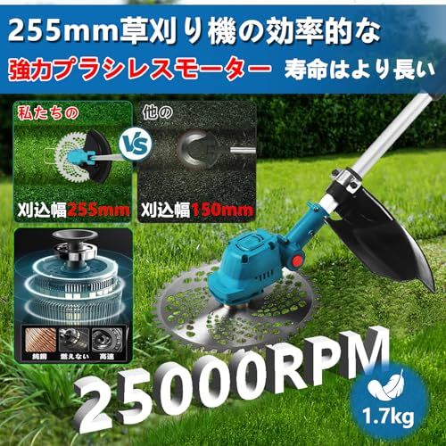 ? 高品質芝刈り機の超高出力ブラシレスモーター & 255mm広刈り幅「▼住宅地家庭用草刈機充電式 25.5cm大型丸ノコ刃採用で灌木や枝も容易に切断。▼25,000回転/分の高出力ブラシレスモーターが従来比30%出力向上&20%省電力を実現。排熱効率が良く全天候作業可能なうえ、騒音を最大20dB低減。灌木対応 草刈り機 の性能を実現。▼住宅地/商業施設でも安心してご利用いただけます。静音草刈機 です。」除草機最長15年使用可能.