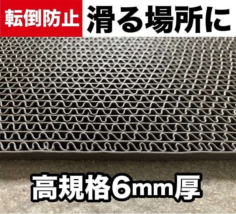 【3】歩行のための超厚: ホームセンターでよく売っている滑り止めマットの厚さは1.5mm~3mm程度。 スタッドレスマットは6mmの超厚仕様なので、踏まれることでシワになることはありません。