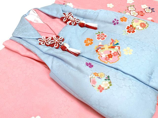 七五三 着物 3歳 正絹 フルセット 女の子 友禅 絵羽柄の着物 被布セット 水色xピンク 鞠と桜 w bBset